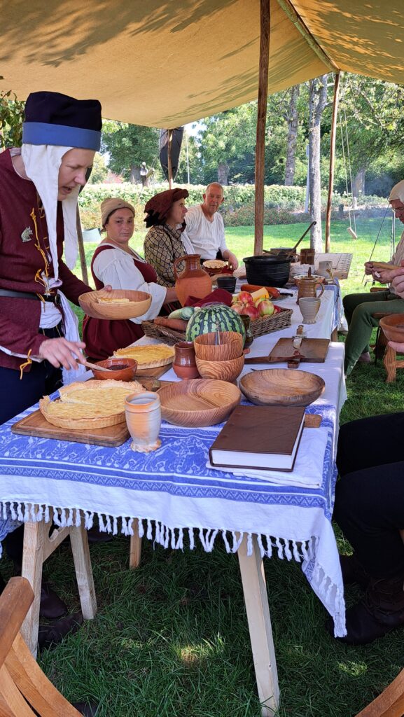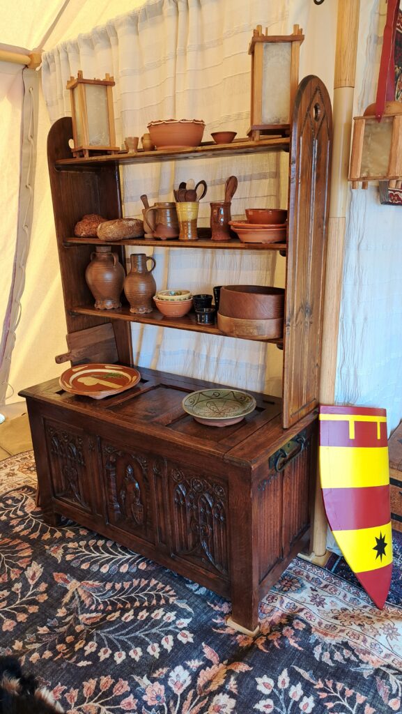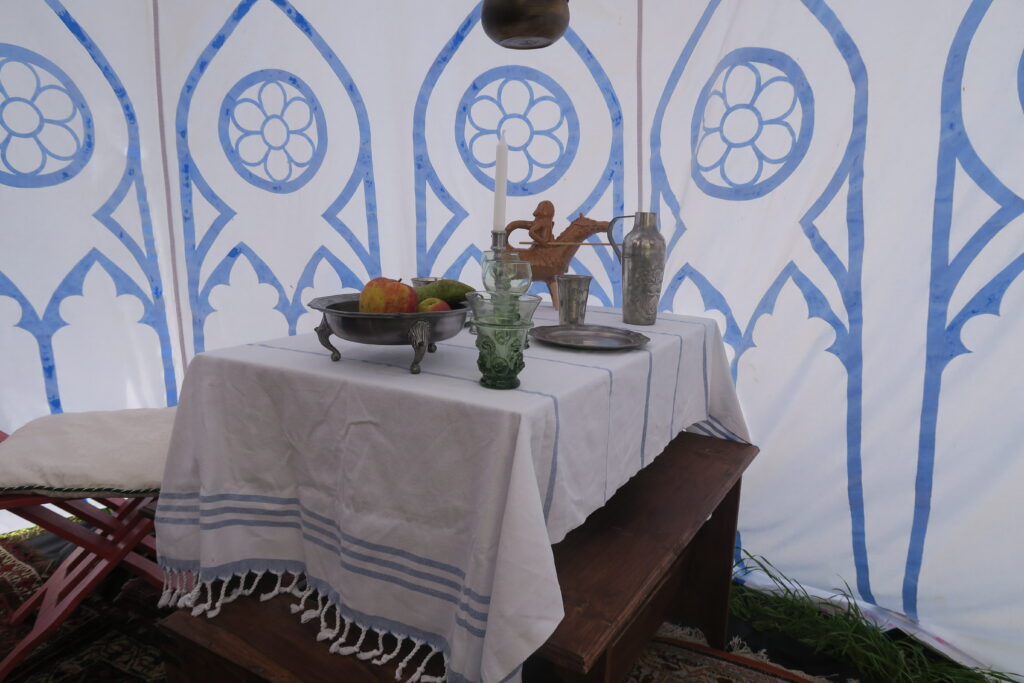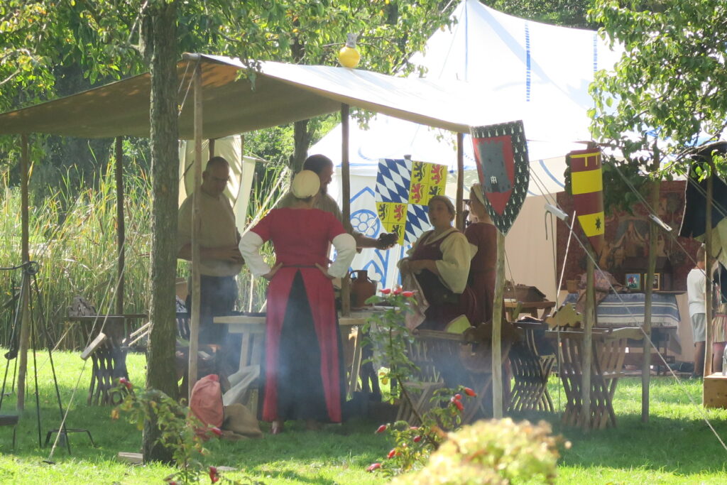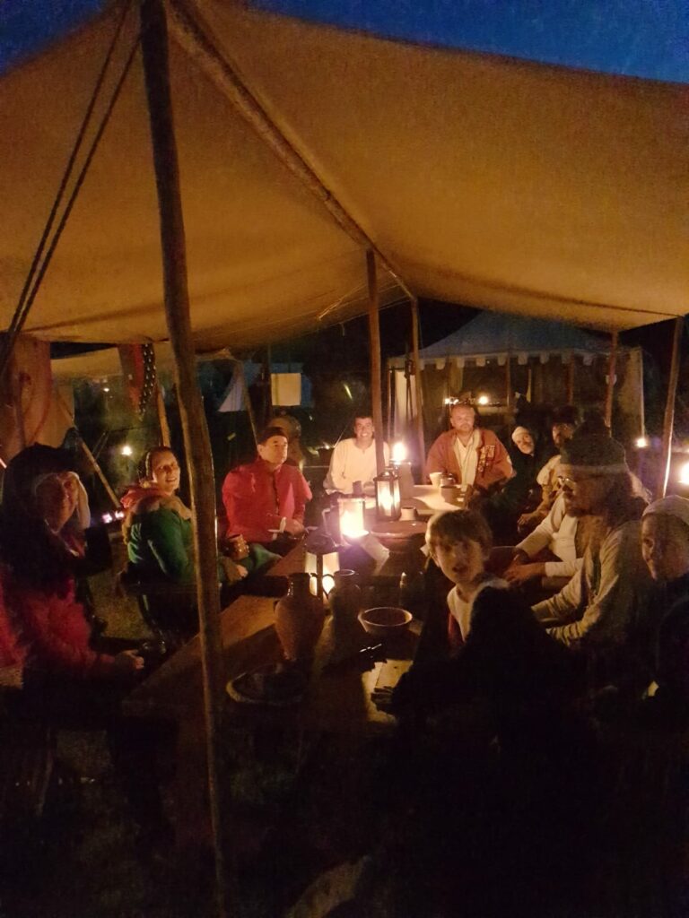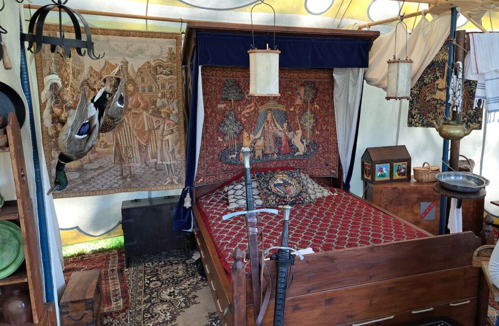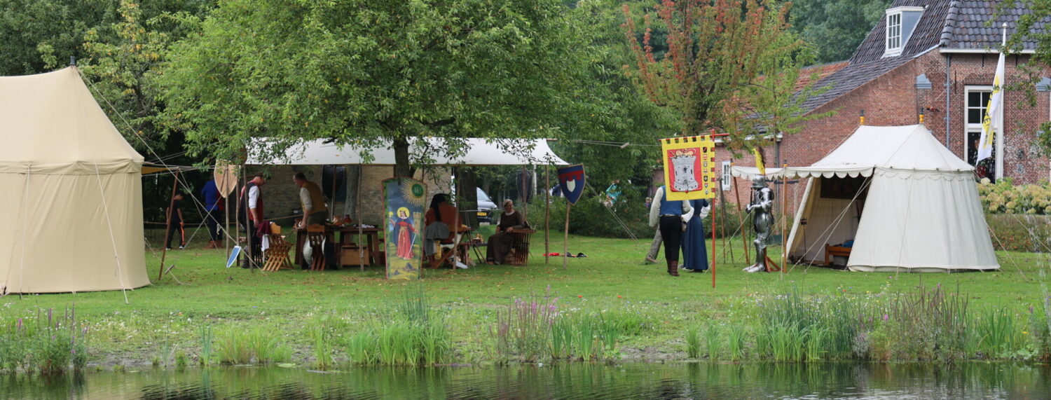 We leven er goed van. In ons kampement kunt u onze tenten met inrichting bekijken: de bedden, kasten en kisten, harnas en kanonnen en onze overige inrichting. ’s Avonds vinden we onze tenten met gemak terug, er staan genoeg lampjes onder de luifel.